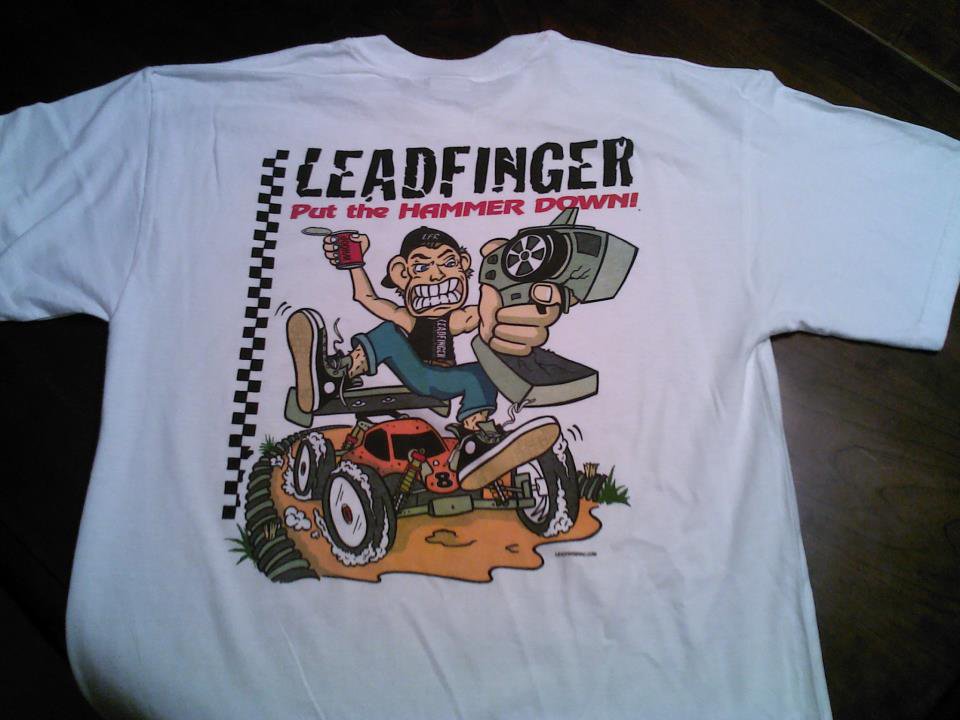 After getting into 1/8, I spent more time at the track becoming good friends with the owner Adam. He also owned a nice sized screen-printing company on the same property and was printing these cool shirts with this funny looking dude on them. (This is where the whoop character came from) Just so happened he was the artist and this was his own cartoon rendering. He gave a shirt to me and showed me some bodies he was making for the smaller 1:18 scale buggies. Now I started to get the whole Leadfinger thing. I thought to myself what a cool idea and thought how creative that was.