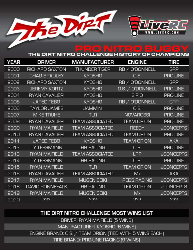 The Dirt Nitro Challenge is among the list of most prestigious 1/8-scale off-road racing events on the planet. As the 21st annual running of this event prepares to kick off, lets take a look at the past 20 years worth of Pro Nitro Buggy class champions and determine the winningest driver, manufacturer, engine, and tire brand in DNC history.